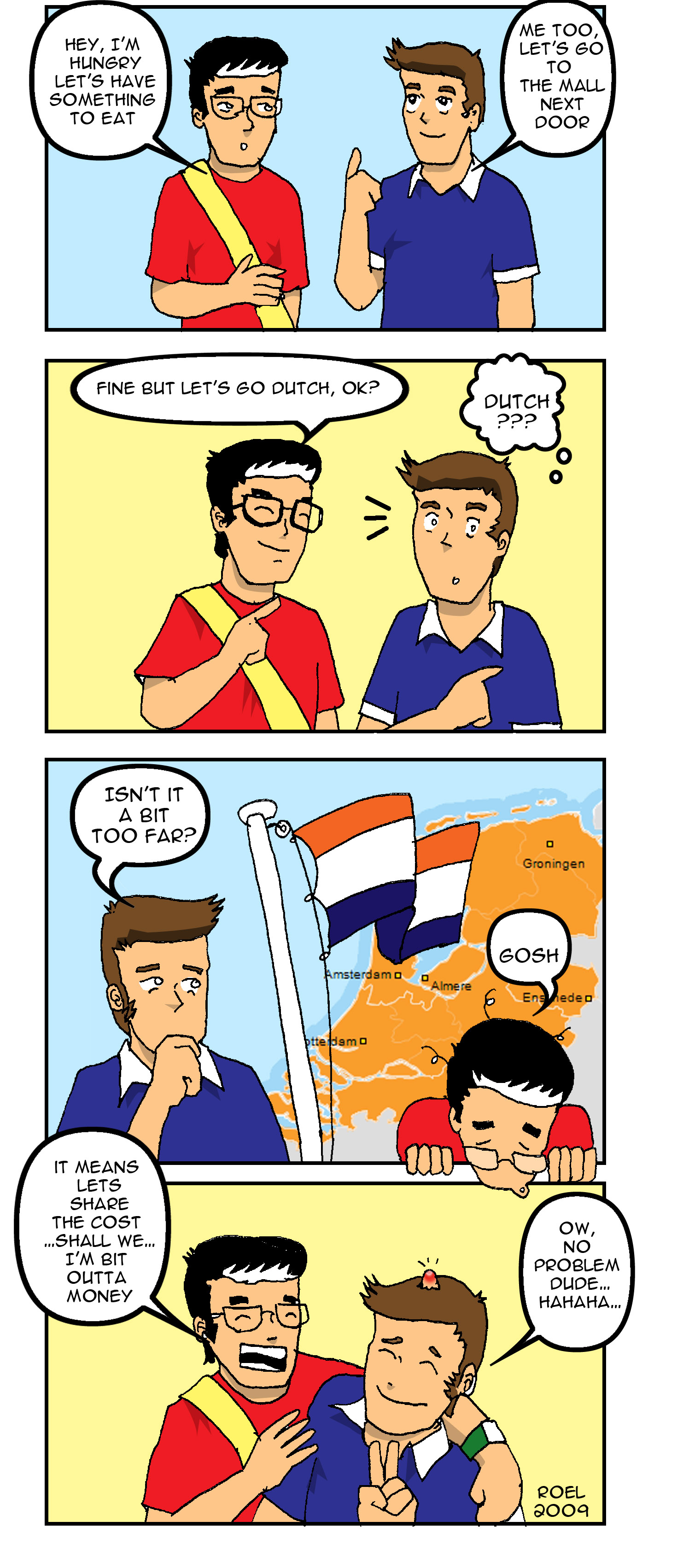 Going Dutch is a term that indicates that each person participating in a group activity pays for himself or herself, rather than any one person paying for anyone else. It is also called Dutch date and Dutch Treat.(wikipedia)